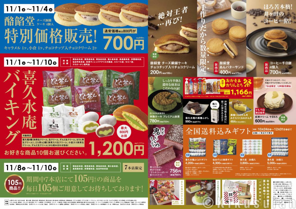 毎年大好評のお茶の増量販売や2割引での販売、喜久福・どら茶んよりどり10個で1200円、